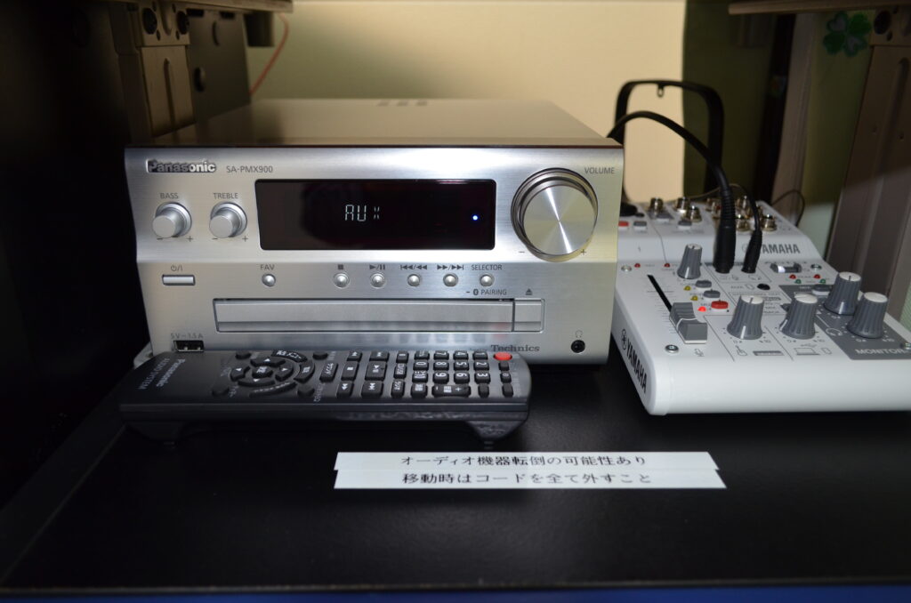 本体前面。Panasonicは基本的にどの製品も金属カバーなので、重厚感があって高級感のあるとても良いデザインです。BASSと書かれたつまみはスピーカーから最大±4低音域を調整できますTREBLEは逆に高音域を調節できますSELECTORボタンで再生機器の選択ができます。詳しくは後程紹介します。