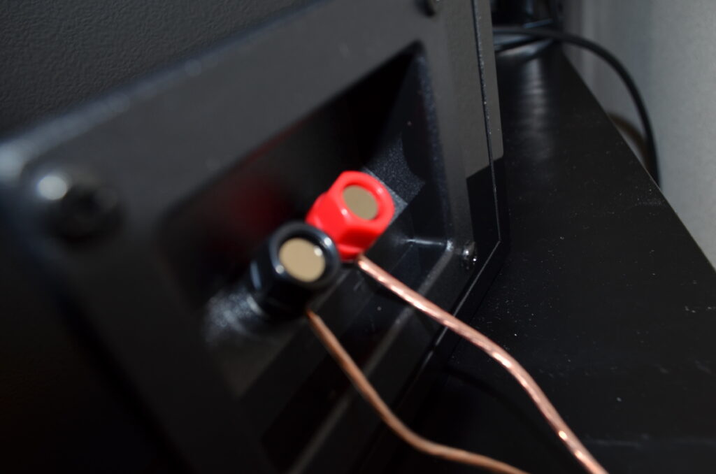 こちらはスピーカーです。低音、中音、高音はそれぞれこの3つのスピーカーがそれぞれの役職をもって一つのチャンネルとして流しています。これにより、1つのスピーカーで流した時より断然クリアに聞こえます。前のサウンドバーも同じようにスピーカーは3つ付いていました。ただ、外がツヤだし加工になっているので指紋やほこりが目立つのでそこは残念でした。