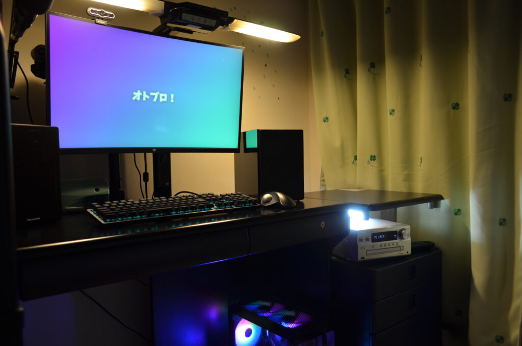 コンポが届き、設置してみました。私の机はそこまで大きくない学習机ですから、スピーカーが乗るか少し不安でしたが、実際載せてみると案外大丈夫そうでした。スペース確保のため、拡張天板の下に本体を置いてみました。なかなか良いのではないでしょうか。